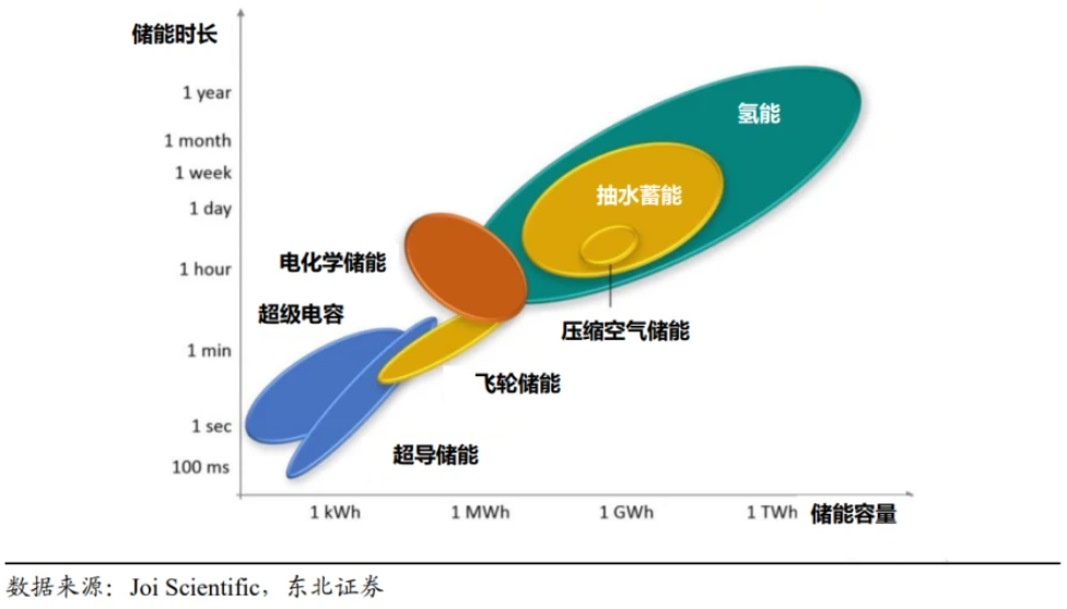 不同儲(chǔ)能形式儲(chǔ)能時(shí)長(zhǎng)與容量對(duì)比